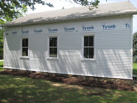 The first event that changes our appearance was the addition of the two front stoops that we started the last week of July. Bill Crowe, the mason who built the foundation, designed the front stoops. The excavation was done and donated by Alan Bourgeois, the excavator of the foundation. Bill and our volunteers poured the footer, layed the block, and faced the block with the original barnstone. With the support of the City Service Department, the cap stones were set on top as the walking surfaces. The Construction Team of volunteers scheduled several work days and have completed the siding on both the front and rear of the OSH. The siding on the east and west sides are scheduled for completionthis next weekend (Aug 9 and 10).