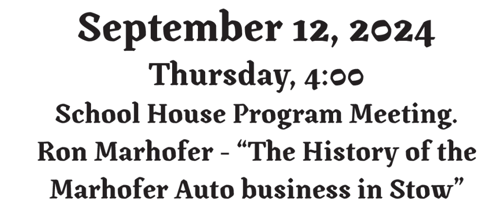 For anyone who has lived in Stow for a long time, Ron Marhofer and their automobile company has been one of the staple community businesses in this town. Join us in welcoming Ron Marhofer to give us all the history of their great company to all those attending our upcoming meeting! It is free and please come to ask many questions and hear about this great Stow company out in the Schoolhouse at the Heritage Reserve Park where we hold most of our Program Meetings on the history of Stow Ohio!