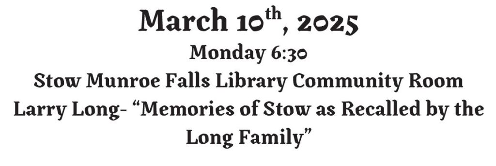 Larry Long will present in the upstairs community room at the Library about his great family history and how it mirrors the history of Stow, Ohio! Please join us there and thank you Larry ahead of time for what will be a great presentation!