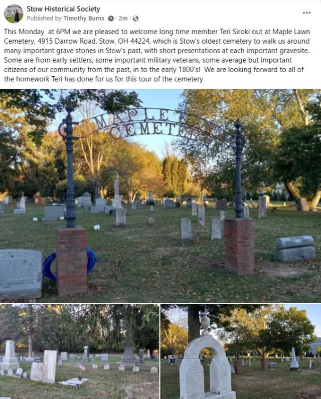 Join us for the first Stow Historical Society program meeting of 2024! Our program, Abolition Restoration Cemetery Workshop, will be presented by cultural heritage archaeologist Michael Lucas. Mr. Lucas is a Kent State University alum and has been working as a Cultural Resource Management archaeologist for ten years. His discussion will include a special emphasis on the local O’Brien Cemetery. Thursday, March 14, 2024 – 4:00 p.m. Location: Stow-Munroe Falls Public Library, 3512 Darrow Rd., Stow, Ohio. Free and open to the public #stowhistory #stowhistorical