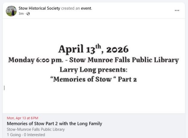 Larry Long will continue his presentation in the upstairs community room at the Library about his great family history and how it mirrors the history of Stow, Ohio! Please join us there and thank you Larry ahead of time for what will be a great presentation like it was last year!